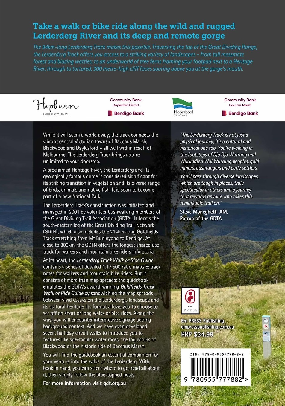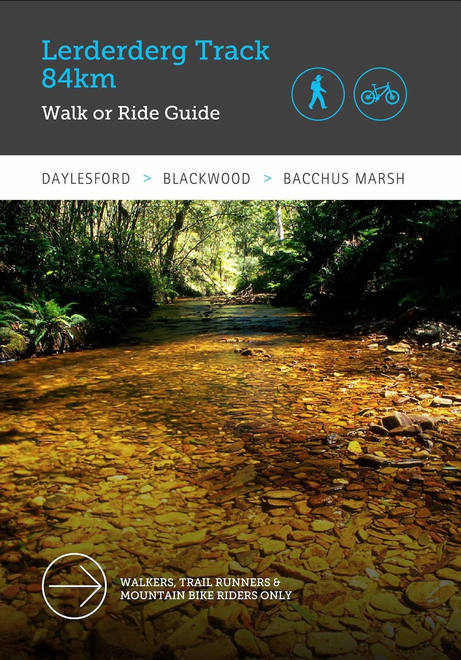 In October, 2025, the Great Dividing Traill Association published the Lerderderg Track Walk or Ride Guide. The track runs for 84 kilometres from Daylesford through Blackwood to Bacchus Marsh. This means that there is now complete map and track note coverage of the whole of the 300km-long Great Dividing Trail Network captured within sturdy wiro-bound guidebook format. The new 144 page guidebook acts as a companion to the GDTA’s highly successful, award-winning Goldfields Track Walk or Ride Guide. It follows a similar style and format, sandwiching the large scale 1:17,500 ratio maps & accompanying track notes between essays by locals and experts on the Lerderderg’s wildly diverse natural beauty and vivid slices of its cultural heritage, people and places. New features in this guide include seven short, half day circuit walks and Welcomes to Country from the two Kulin Nation language groups whose traditional lands encompass the Lerderderg Track – the Dja Dja Wurrung in the north and the Wurundjeri Woi Wurrung in the south.